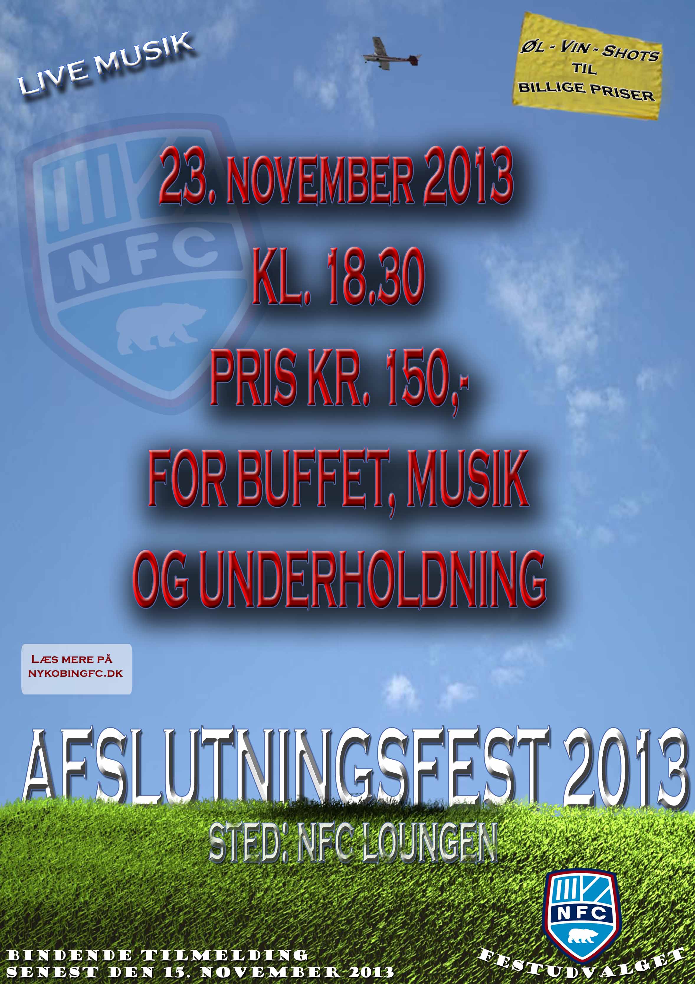 Så er det tid til afslutningsfest 2013 (U19 og opefter) for Nykøbing FC, og vi håber på stort fremmøde. Så sæt kryds i kalenderen og tilmeld dig allerede nu, hvis du er træner, leder, spiller eller lign. i NFC.<br /><br />