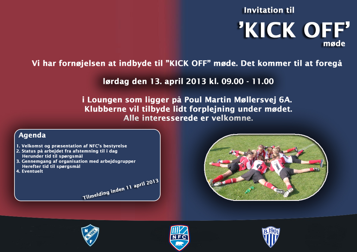 | 18.04.13 | Kick-off mødet den 13. april 2013 Knap 100 personer var dukket op til kick-off mødet i Loungen. Her blev orienteret om hvem der var i den midlertidige bestyrelse, status på fusionen, status på fondsansøgninger, hvordan Nykøbing FC skal træne i fremtiden og til sidst var der tid til spørgsmål fra de fremmødte. Blandt andet kunne den den nye spillertrøje vises frem (se nedenstående billeder), og der kunne oplyses om, at der skulle bestilles 1000 stk's af disse til 1. juli, så alle starter i samme tøj fra dag 1. Derudover fortalte børne- og ungdomskonsulent Claus Rossing om hvordan Nykøbing FC i fremtiden får et koncept, som kigger på udvikling fremfor resultater i børnefodbold. Den røde tråd som Claus Rossing fortalte om, kommer fra DBU's hæfte holdninger og handlinger, som skal implementeres i Nykøbing FC. René F Sørensen kunne oplyse om, at vi stadig kørte efter "det grønne hæfte". Indtil det nye klubhus står skal vi dog stadigvæk træne på de 2 anlæg, som fremover vil hedde NFC Syd (B.1921) og NFC Nord (B.1901. Hvor holdene skal træne er endnu uvist, men det arbejder en arbejdsgruppe på. Da det er en større kabale, så håber vi på medlemmernes forståelse. Alt i alt en dag hvor der var rigtig meget optimisme at spore hos de fremmødte. |