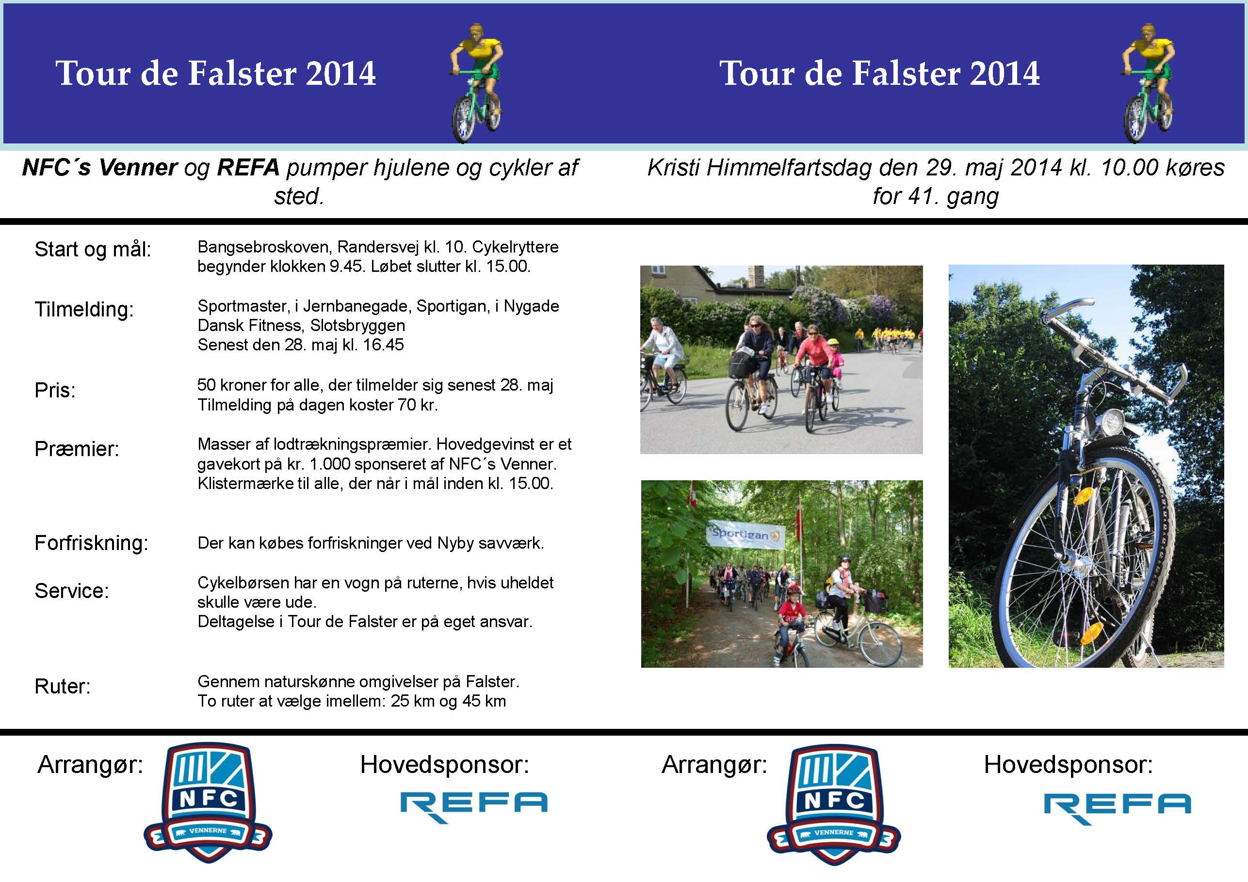 Kristi Himmelfartsdag den 29. maj 2014 kl. 10.00 køres for 41. gang Tour de Falster. NFC's venner er arrangør for løbet, og sponsor er i år Refa.